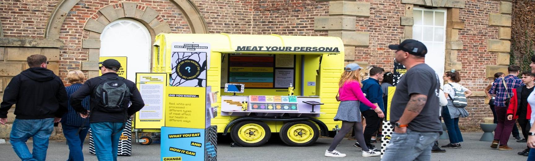 Why is this important? 'We are so detached, most of us, from the food system. We are increasingly an urbanised population, food just appears in the supermarket, and I want to talk to people and get them to understand the impacts of what they are eating,' Yates tells me, explaining her motivation for doing this type of work. Yates has a very practical, audience first approach to her engagement work. Surveys at the beginning of the LEAP project in 2018 showed that most of the UK population didn't understand or agree that meat eating had an environmental impact. Yates's solution? Go where there are large numbers of people - shopping centres. Working with a creative agency, Yates designed the Meat Your Persona exhibit, a bright yellow horsebox that could be unpacked and moved around the country. 'If you have been listening,' she explains, 'by the end [of an event] you will know what the public want to know. I love that. It is really great for our scientists too'.